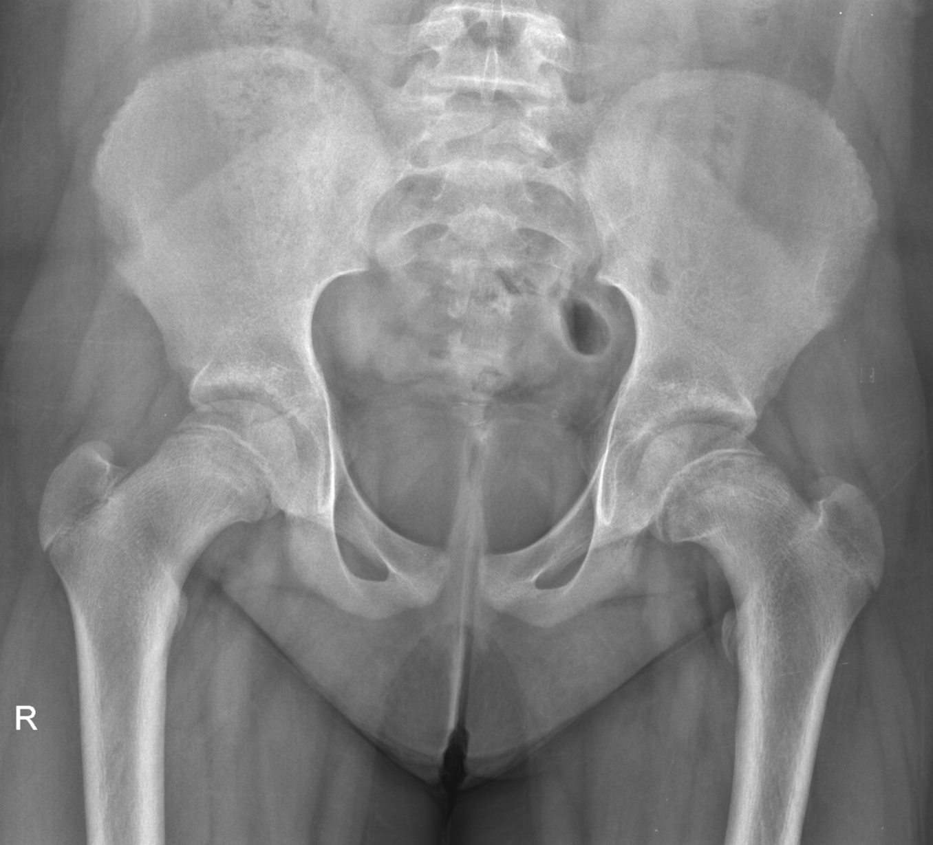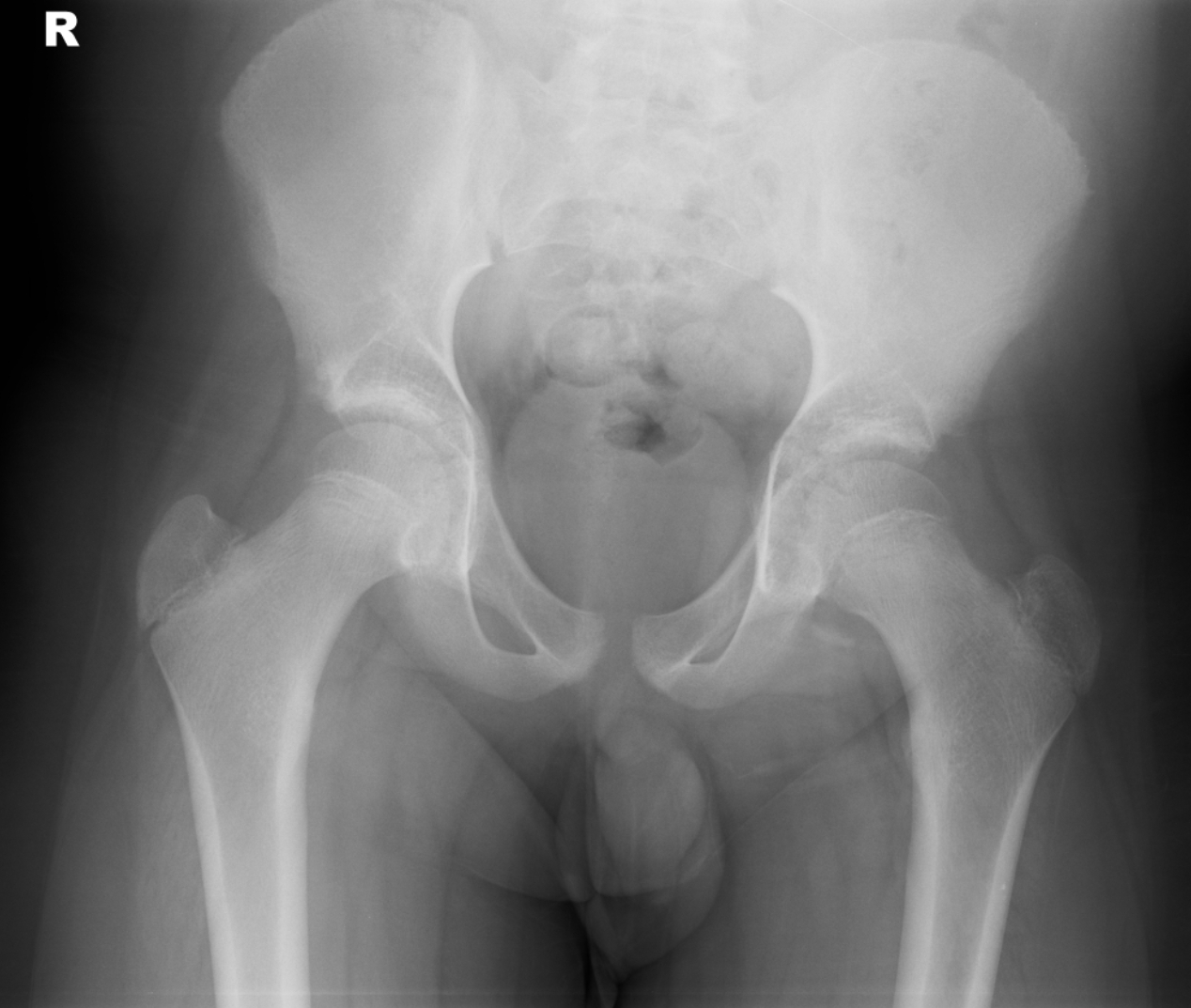 Comment: most commonly this abnormality occurs on one side only, and that allows the reader to compare the symptomatic side with the (presumed) normal and asymptomatic side. In this patient, it is likely that the slip occurred on one side initially and then following a few weeks of putting more weight through the unaffected hip the second slip occurred.